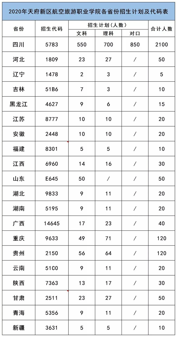 注:各省份具體招收計劃詳見“2020年天府新區(qū)航空旅游職業(yè)學(xué)院各省份招生計劃及代碼表”。