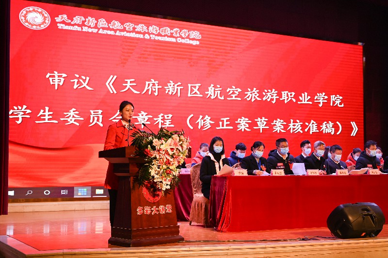 大會由學(xué)院學(xué)生會主席團(tuán)成員董遠(yuǎn)芃作學(xué)生會工作報告。會上,由學(xué)院學(xué)生會秘書長蔣琴楊宣讀《天府新區(qū)航空旅游職業(yè)學(xué)院委員會章程(修正案草案核準(zhǔn)稿)》,并由全體代表審議,全票通過。