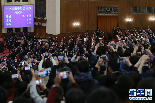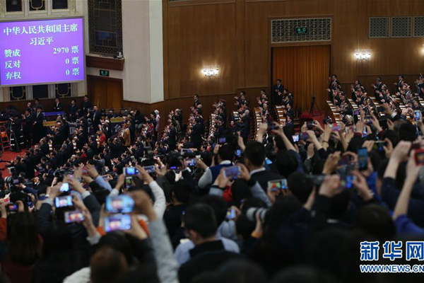3月17日,十三屆全國人大一次會議在北京人民大會堂舉行第五次全體會議。習(xí)近平全票當(dāng)選為國家主席、中央軍委主席。 新華社記者 金立旺 攝
