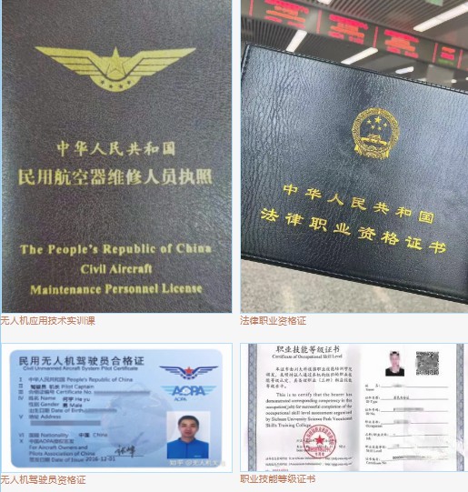 民用航空器維修人員執(zhí)照、機務(wù)維修147基礎(chǔ)執(zhí)照、鉗工證、電工證、CCAR-147技能培訓(xùn)證書、民用航空器維修基礎(chǔ)執(zhí)照、無人機駕駛員執(zhí)照、民用無人機系統(tǒng)專業(yè)工程師資質(zhì)、計算機技術(shù)與軟件技術(shù)資格(水平)證書、全國信息化工程師證、數(shù)據(jù)庫系統(tǒng)工程師證、數(shù)據(jù)庫工程師、軟件測試工程師、CCAT認證、NCRE認證、NIT認證、速錄師、法律職業(yè)資格證、普通話證書、大學(xué)英語等級證書等。
