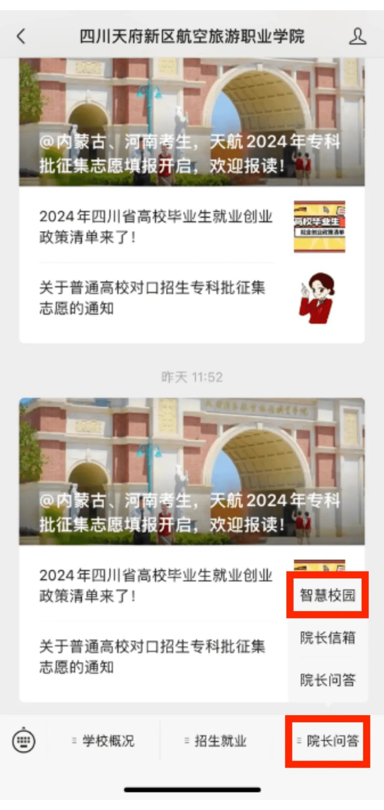 進入微信公眾號,點擊頁面右下角“院長問答”,選擇“智慧校園”;