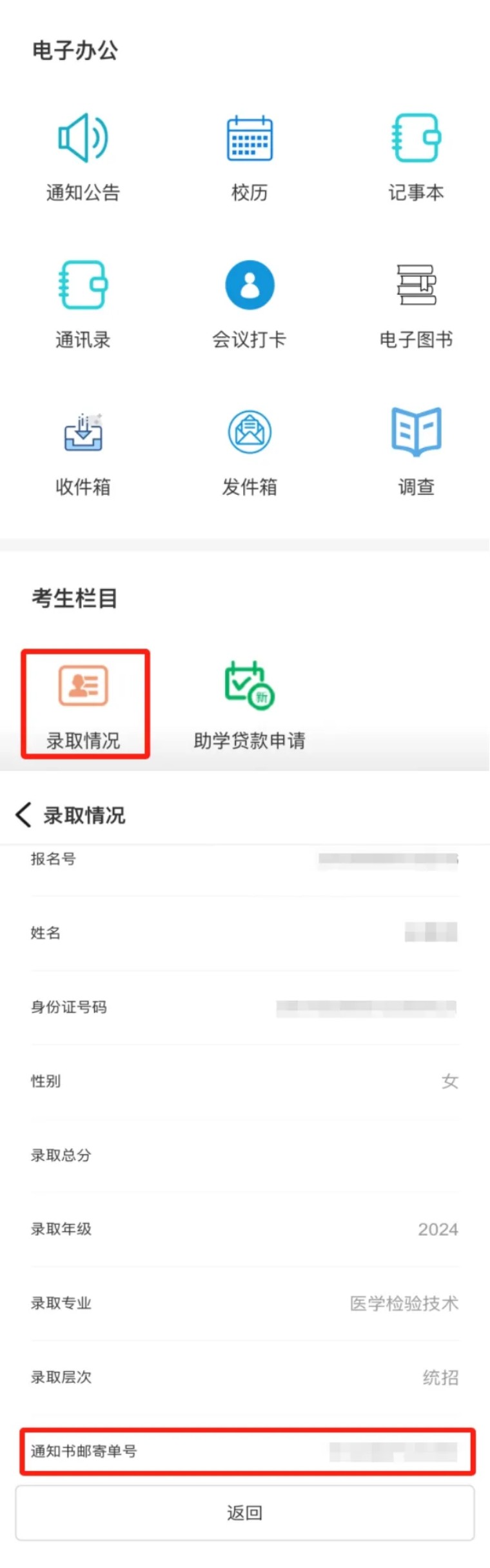 點擊考生欄目中的“錄取情況”,即可查看錄取結(jié)果、錄取專業(yè)、通知書郵寄單號(EMS單號)等信息。