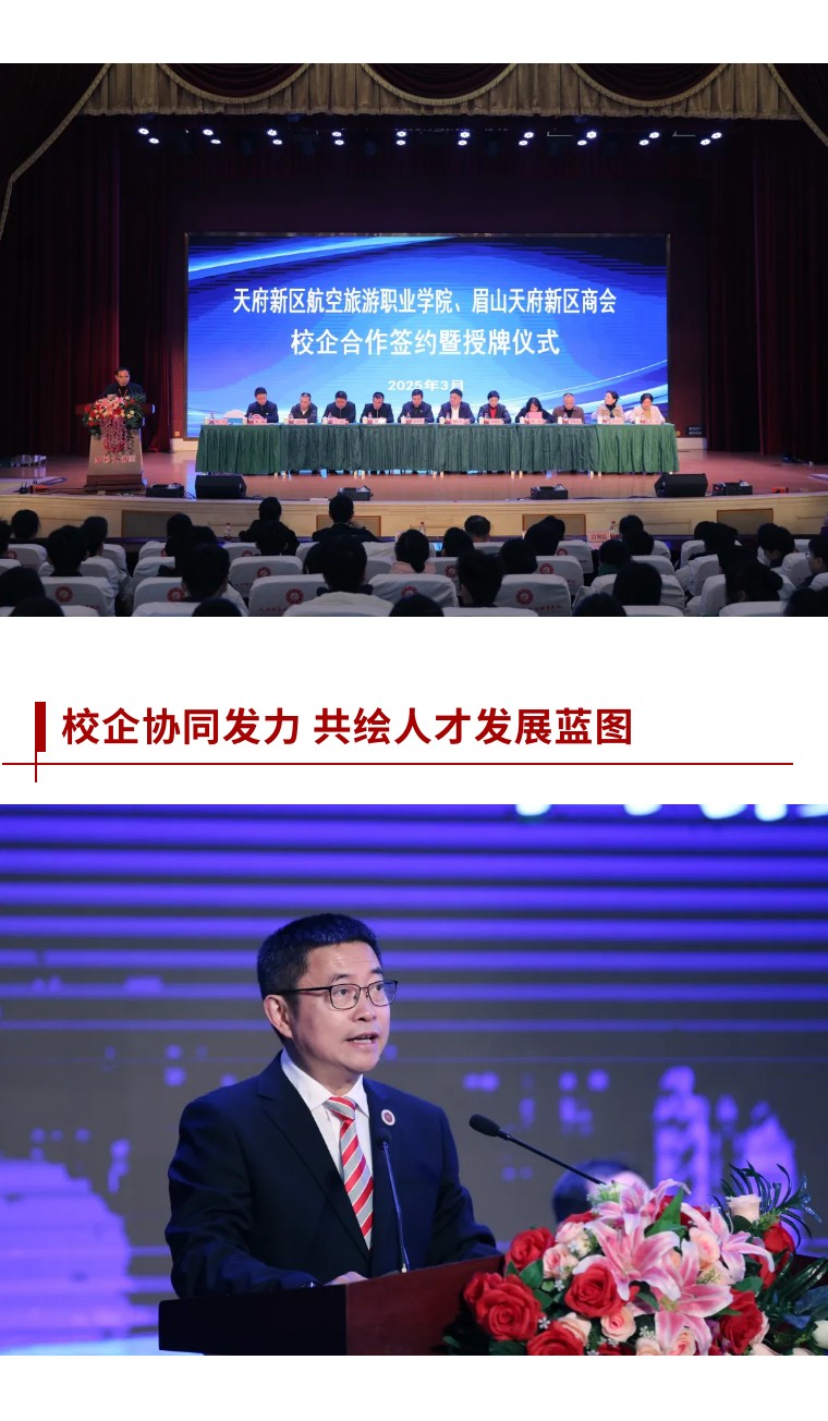 3月11日,天府新區(qū)航空旅游職業(yè)學(xué)院與眉山天府新區(qū)商會(huì)舉行校企合作簽約暨授牌儀式。眉山市人大常委會(huì)副主任、天府新區(qū)眉山黨工委常務(wù)副書(shū)記廖仁軍,眉山市委統(tǒng)戰(zhàn)部副部長(zhǎng)、市工商聯(lián)黨組書(shū)記何建瓊,眉山天府新區(qū)一級(jí)調(diào)研員陳青松,眉山市工商聯(lián)黨組成員、副主席劉前線,天府新區(qū)眉山黨工委黨群工作部副部長(zhǎng)潘燕,天府新區(qū)眉山黨工委黨群工作部副部長(zhǎng)王冰,眉山天府新區(qū)商會(huì)會(huì)長(zhǎng)范松如,四川新達(dá)粘膠科技有限公司總經(jīng)理郭明高,四川五洲仁信科技有限公司總經(jīng)理鄧永紅,四川厚天科技股份有限公司總經(jīng)理蔡敏,四川東星航空教育集團(tuán)董事長(zhǎng)、天府新區(qū)航空旅游職業(yè)學(xué)院總督學(xué)辜英智,天府新區(qū)航空旅游職業(yè)學(xué)院院長(zhǎng)劉陽(yáng)等學(xué)校相關(guān)領(lǐng)導(dǎo)及師生代表共同見(jiàn)證這一重要時(shí)刻。