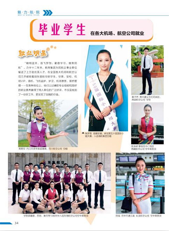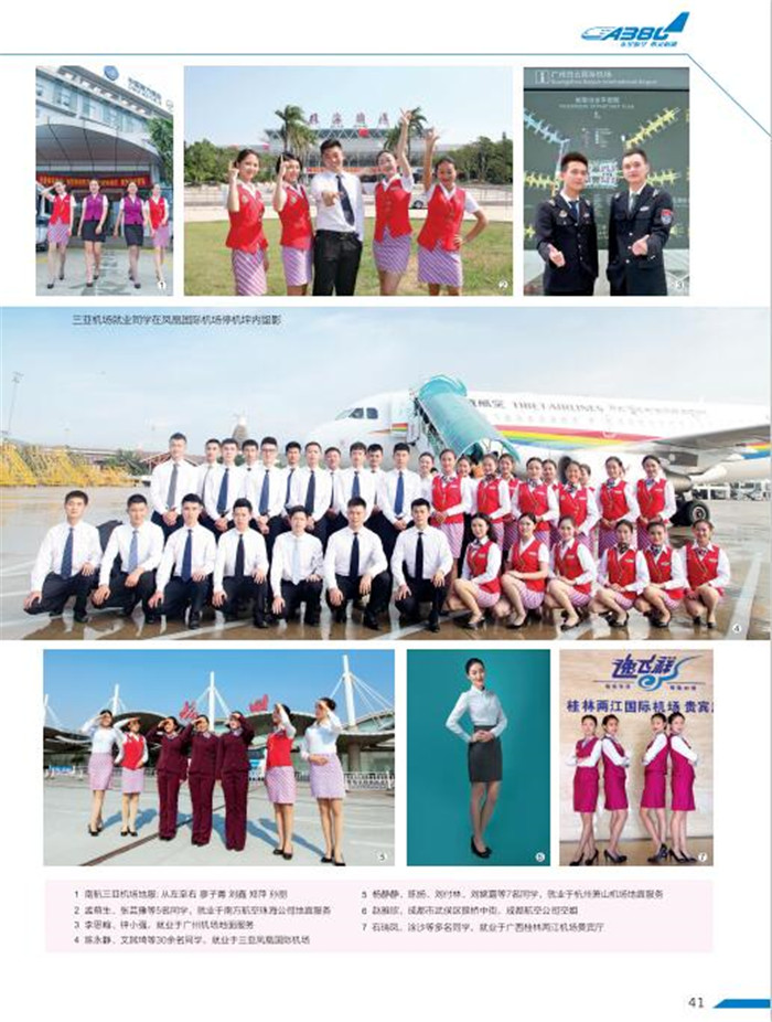 學(xué)生入學(xué)簽訂《就業(yè)合同書(shū)》,合格畢業(yè)后,由學(xué)院就業(yè)處推薦到國(guó)內(nèi)外機(jī)場(chǎng)、航空公司、旅行社、鐵路局等相關(guān)企事業(yè)單位工作,主要從事:空中乘務(wù)、空中安保、機(jī)場(chǎng)安檢、VIP貴賓服務(wù)、機(jī)場(chǎng)值機(jī)、易登機(jī)、機(jī)場(chǎng)物流、海關(guān)、旅游景區(qū)、機(jī)務(wù)維修、無(wú)人機(jī)駕駛員、旅行社、高鐵乘務(wù)、動(dòng)車(chē)乘務(wù)、高鐵站、地鐵站、軟件工程師、國(guó)內(nèi)外電子商務(wù)崗位、會(huì)展策劃與管理等崗位工作。
